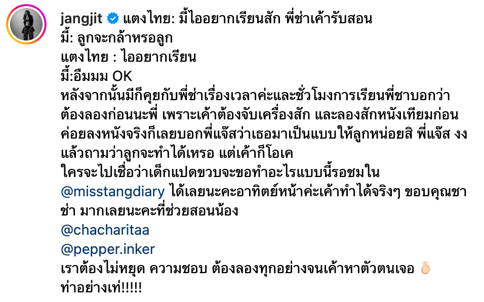 ใครจะไปเชื่อว่าเด็กแปดขวบจะขอทำอะไรแบบนี้รอชมใน @misstangdiary ได้เลยนะคะอาทิตย์หน้าค่ะเค้าทำได้จริงๆ ขอบคุณชาช่า มากเลยนะคะที่ช่วยสอนน้อง @chacharitaa @pepper.inker เราต้องไม่หยุด ความชอบ ต้องลองทุกอย่างจนเค้าหาตัวตนเจอ ท่าอย่างเท่!!!!!”