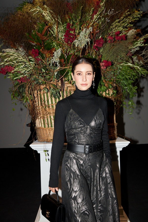 งานนี้สมกับเป็นแม่ ดูดีแบบตะโกนในลุคสุดคลาสสิก Henri Floral Jacquard Cocktail Dress จับคู่กับสเว็ตเตอร์คอเต่าสีดำ ทั้งหมดนี้จากซีซั่นล่าสุด