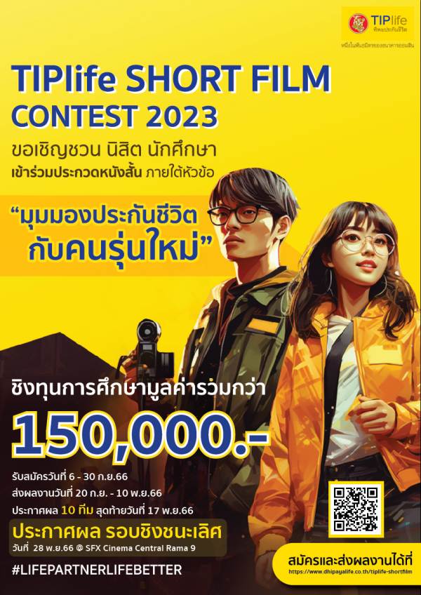 ล่าสุด บริษัท ทิพยประกันชีวิต จำกัด (มหาชน) “ทิพยประกันชีวิต” หรือ TIPlife จึงมีแนวคิดก้าวเข้าสู่โลกยุคใหม่เพื่อสร้างโอกาสในการเข้าถึงกลุ่มคนรุ่นใหม่ ที่ต้องการทำประกันชีวิตให้มีความรู้และความเข้าใจที่ถูกต้องในการเลือกทำประกันชีวิตโดยความสมัครใจตามปัจจัยเหตุผลและไลฟ์สไตล์ของแต่ละคน ผ่านเรื่องราวของหนังสั้นที่เปิดเวทีให้น้องๆ เยาวชน นักศึกษาได้ผลิตภาพยนตร์สั้นเข้าร่วมประกวดเพื่อเปิดมุมมองการทำประกันชีวิตกับคนรุ่นใหม่หรือเพื่อให้คนรุ่นใหม่เข้าถึงความรู้ในการเลือกซื้อประกันชีวิตมากขึ้น ใน โครงการประกวดหนังสั้น TIPlife Short Flim Contest 2023 ภายใต้แนวคิด TIPLIFE LIFE PARTNER LIFE BETTER “เพราะเชื่อว่าชีวิตที่ดีย่อมต้องมีหุ้นส่วนที่ดีเสมอ” ให้กับเยาวชนนักศึกษาได้แสดงความสามารถผ่านการประกวดหนังสั้น 3 นาที ภายใต้หัวข้อ “มุมมองประกันชีวิตกับคนรุ่นใหม่” ชิงเงินรางวัลรวมกว่า 150,000 บาท