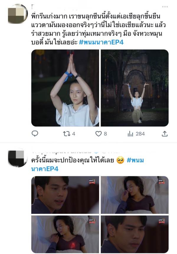 แต่ที่ได้ใจแฟนละครไปชุดใหญ่ ต้องยกให้ฉาก “ระบำนาคนารี” ที่กรีน และ “ญิ๋งญิ๋ง-ศรุชา เพชรโรจน์” (โสวันนี) ร่ายรำ มีความสวย สง่า ทรงเสน่ห์ และมีมนต์ขลัง สมกับความทุ่มเท ในการซ้อมรำแบบมาราธอน