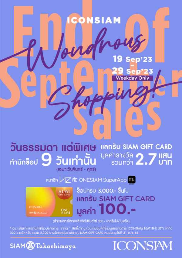 ไอคอนสยาม จัดแคมเปญโปรโมชั่น “ICONSIAM WONDROUS SHOPPING: End of September Sales!” ชวนเหล่านักช้อปยิ้มสู้โปรร้อนเดือนกันยายน เพียงมาเลือกซื้อสินค้าและบริการต่างๆ ภายในไอคอนสยาม และสยาม ทาคาชิมายะ (เฉพาะวันจันทร์ – ศุกร์) และมียอดซื้อครบตามกำหนด สามารถแลกรับ SIAM GIFT CARD มูลค่ารวมกว่า 2.7 แสนบาท