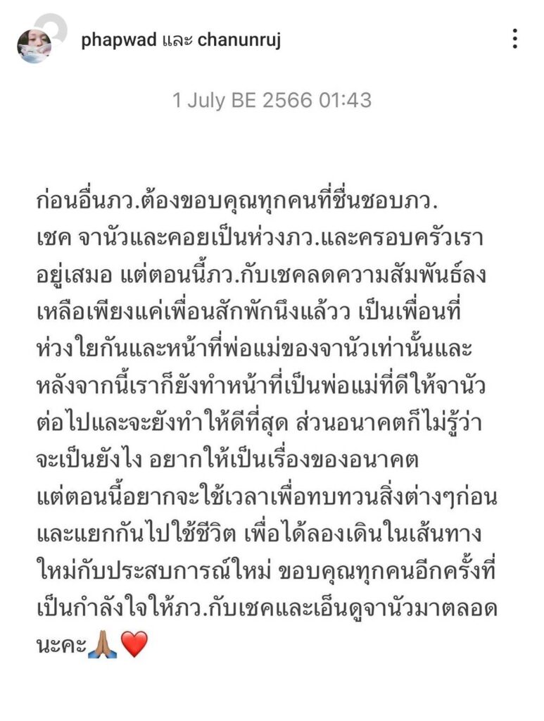 ซึ่ง สาวภาพวาด โพสต์ข้อความผ่านทางอินสตาแกรมส่วนตัวพร้อมแท็ก หนุ่มเช็ค ไว้ว่า “ก่อนอื่นภว.ต้องขอบคุณทุกคนที่ชื่นชอบภว. เชค จานัว และคอยเป็นห่วงภว.และครอบครัวเราอยู่เสมอ แต่ตอนนี้ภว.กับเชคลดความสัมพันธ์ลง เหลือเพียงแค่เพื่อนสักพักนึงแล้วว เป็นเพื่อนที่ห่วงใยกัน และทำหน้าที่พ่อแม่ของจานัวเท่านั้น และหลังจากนี้เราก็ยังทำหน้าที่เป็นพ่อแม่ที่ดีให้ จานัว ต่อไป และจะยังทำให้ดีที่สุด ส่วนอนาคตก็ไม่รู้ว่าจะเป็นยังไง อยากให้เป็นเรื่องของอนาคต แต่ตอนนี้อยากจะใช้เวลาเพื่อทบทวนสิ่งต่างๆ ก่อน และแยกกันไปใช้ชีวิต เพื่อได้ลองเดินในเส้นทางใหม่กับประสบการณ์ใหม่ ขอบคุณทุกคนอีกครั้งที่ เป็นกำลังใจให้ ภว. กับ เชค และเอ็นดู จานัว มาตลอดนะคะ”