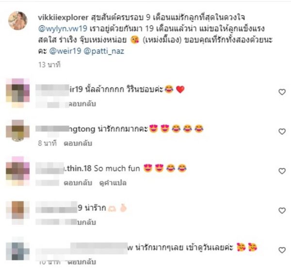 ล่าสุด หม่ามิ๊วิกกี้ โพตต์ภาพคู่กับลูกสาว พร้อมกับแคปชั่นไว้ว่า “สุขสันต์ครบรอบ 9 เดือนแม่รักลูกที่สุดในดวงใจ @wylyn.vw19 เราอยู่ด้วยกันมา 19 เดือนแล้วน่า แม่ขอให้ลูกแข็งแรง สดใส ร่าเริง จุ๊บเหม่งหน่อย (เหม่งมี๊เอง) ขอบคุณที่รักทั้งสองด้วยนะคะ @weir19 @patti_naz”
