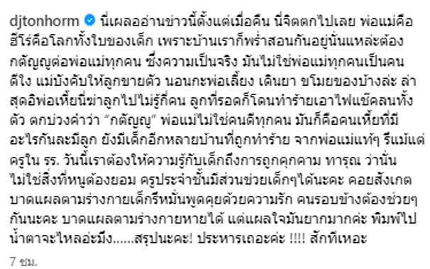 ตกบ่วงคำว่า “กตัญญู” พ่อแม่ไม่ใช่คนดีทุกคน มันก็คือคนเหี้ยที่มีอะไรกันละมีลูก ยังมีเด็กอีกหลายบ้านที่ถูกทำร้าย จากพ่อแม่แท้ๆ รึแม้แต่ครูใน รร. วันนี้เราต้องให้ความรู้กับเด็กถึงการถูกคุกคาม ทารุณ ว่านั่นไม่ใช่สิ่งที่หนูต้องยอม ครูประจำชั้นมีส่วนข่วยเด็กๆได้นะคะ คอยสังเกตบาดแผลตามร่างกายเด็กรึหมั่นพูดคุยด้วยความรัก คนรอบข้างต้องช่วยๆกันนะคะ บาดแผลตามร่างกายหายได้ แต่แผลใจมันยากมากค่ะ พิมพ์ไปน้ำตาจะไหลอ่ะมึง……สรุปนะคะ! ประหารเถอะค่ะ !!!! สักทีเหอะ”