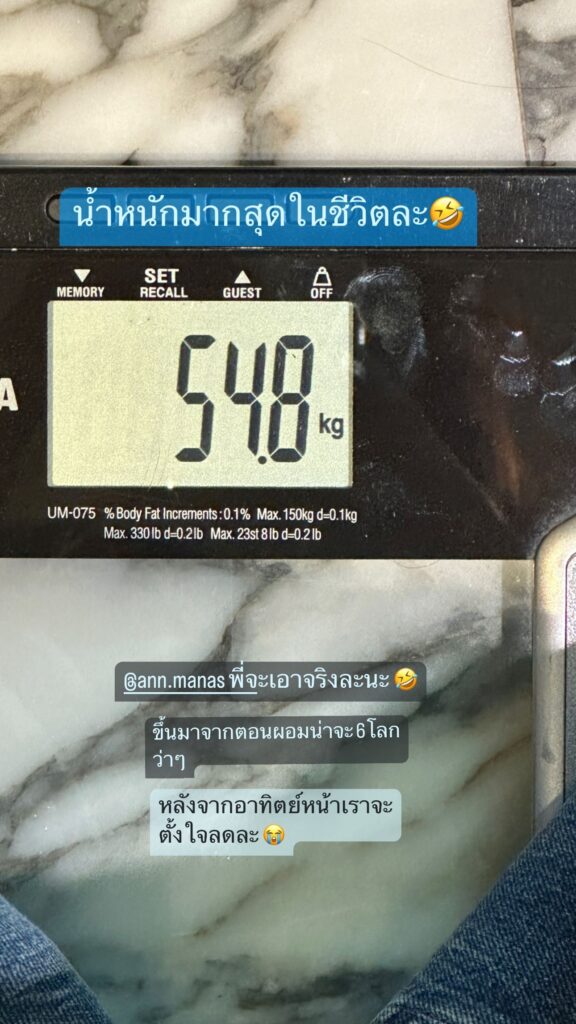 แต่ล่าสุด พี่อั้ม ช็อกสุด ๆ! เมื่อ พี่อั้ม ชั่งน้ำหนัก และเมื่อผลออกมาคืออยู่ที่ 54.8 กิโลกรัม ซึ่ง พี่อั้ม โพสต์สตอรี่พร้อมข้อความไว้ว่า “น้ำหนักมากสุดในชีวิตละ พี่จะเอาจริงละนะ ขึ้นมาจากตอนผอมน่าจะ 6 โลกว่า ๆ หลังจากอาทิตย์หน้าเราจะตั้งใจลดละ” ขอบอกเลยว่า ไม่ว่าน้ำหนักจะขึ้นลงแค่ไหน แต่ความสวยความเป๊ะก็ยังคงอยู่เสมอ เพราะแม่ก็คือแม่😍