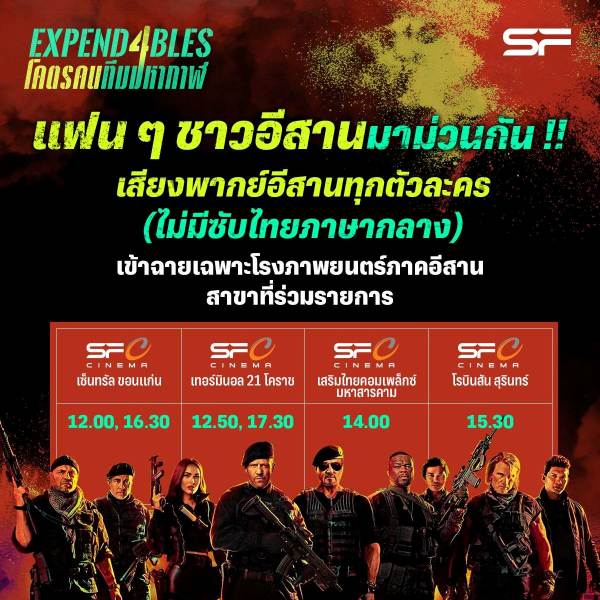 เมื่อทีมเลือดเก่าประทะทีมเลือดใหม่ ตายต่อตาย มันส์ต่อมันส์ พบกับฉากต่อสู้ของ จา พนม ที่เยอะและมันส์ที่สุดกว่าเรื่องที่ผ่าน ๆ มา ใน “Expendables4 โคตรคนทีมมหากาฬ” บู๊สะใจดูก่อนอเมริกา วันนี้ในโรงภาพยนตร์ทั่วประเทศ พิเศษ!ที่สุดแห่งความมันส์ยิ่งกว่า ท้าให้คุณดูในระบบ 4DX ในสาขา พารากอน ซีนีเพล็กซ์, ไอคอน ซีเนคอนิค, พรอมานาด ซีนีเพล็กซ์, เมกา ซีนีเพล็กซ์, เวสต์เกต ซีนีเพล็กซ์, เมเจอร์ ซีนีเพล็กซ์ รัชโยธิน, เมเจอร์ซีนีเพล็กซ์ เซ็นทรัลเฟสติวัล เชียงใหม่, หาดใหญ่ ซีนีเพล็กซ์