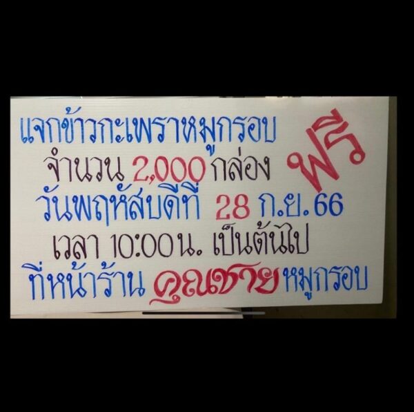 ล่าสุด หนุ่มอาร์ต ได้แจกข้าวกล่อง 2,000 กล่อง โดยโพสต์รูปพร้อมแคปชั่นว่า“แจกข้าวกะเพระาหมูกรอบ จำนวน 2,000 กล่อง ฟรี วันพฤหัสบดีที่ 28 ก.ย. 66 เวลา 10:00 น. เป็นต้นไป ที่หน้าร้าน คุณชายหมูกรอบ”