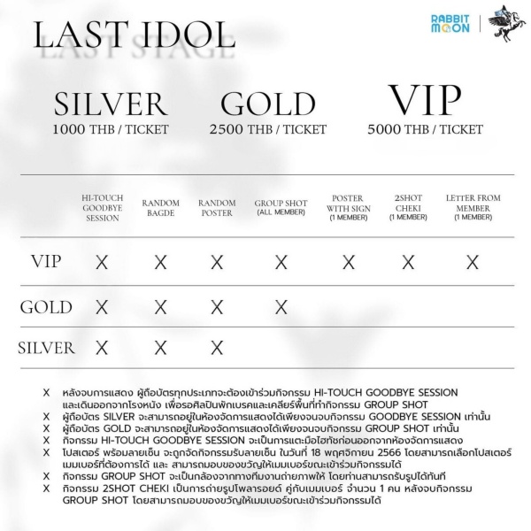 LAST STAGE LAST IDOL เปิดจำหน่ายบัตรแล้วตั้งแต่วันนี้ แบ่งราคาบัตรเป็น Silver Package 1,000 บาท / Gold Package 2,500 บาท / VIP Package 5,000 บาท (โปรโมชั่นพิเศษ! จองบัตรวันนี้ รับส่วนลด 10% ทันที ภายในวันที่ 30 กันยายน นี้) สามารถเข้าไปจองบัตรกันได้แล้วที่ https://shop.lastidol.co.th/th