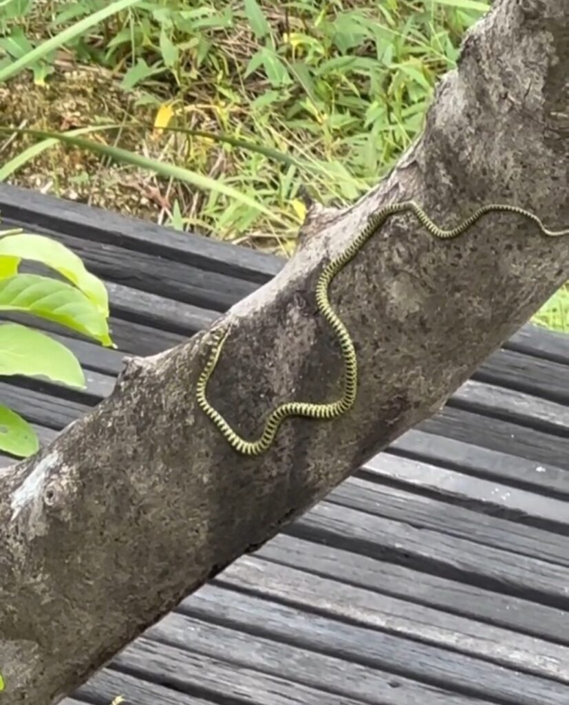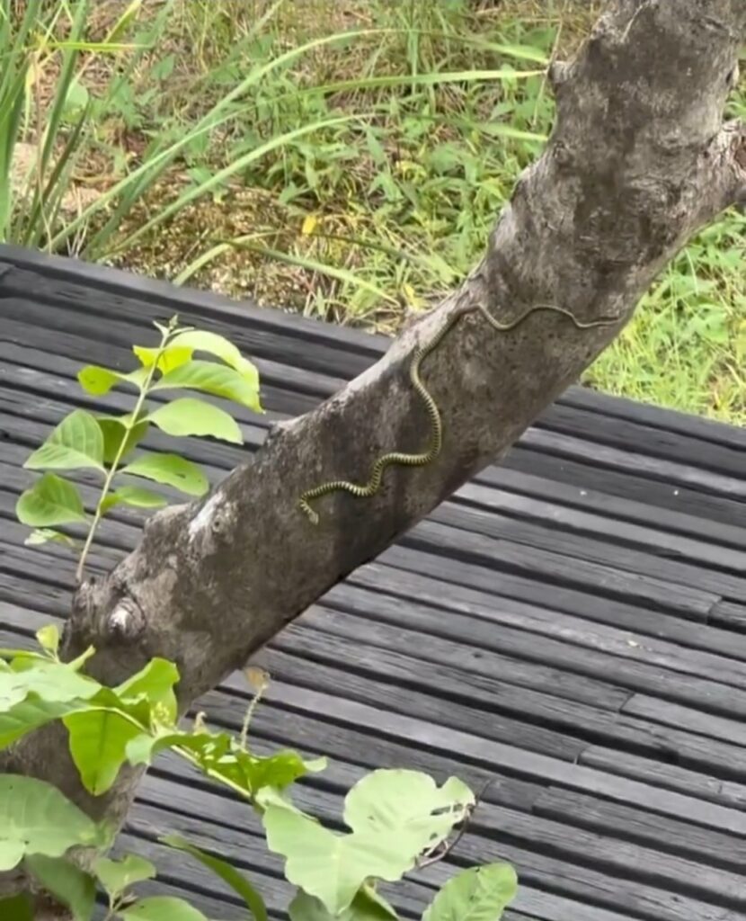 แต่สิ่งที่ทำเอาต้องสะดุดตาสุด ๆ คือเจองูลเลื้อยเล่นอยู่ตรงบริเวณต้นไม้ใกล้ตัวบ้าน บอกเลยว่าใกล้ชิดธรรมชาติสุด ๆ