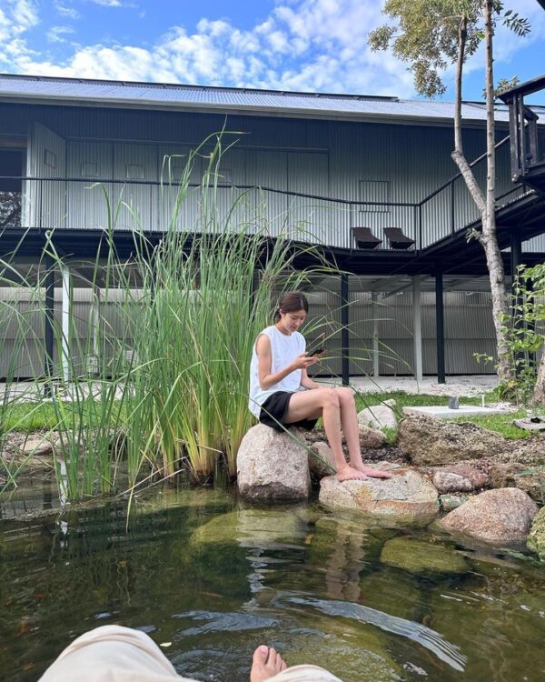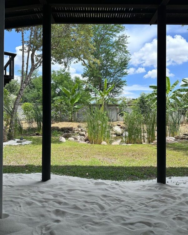 สำหรับคู่รักสายเที่ยว อย่าง โทนี่ รากแก่น – แก้ว จริญญา ที่ตั้งใจสร้างบ้านหลังนี้ขึ้นมาเผื่ออยู่อาศัย โดยออกแบบมาได้ธรรมช่าติสุด ๆ โดยใช้พื้นที่รอบบ้านปลูกผักผลไม้ รวมไปถึงขุดบ่อน้ำไว้เลี้ยงปลาอีกด้วย