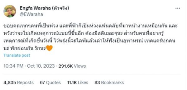 โดยล่าสุด สาวอิงฟ้า โพสต์ข้อความผ่านทวิตเตอร์ (X) ไว้ว่า “ขอบคุณทุก ๆ คนที่เป็นห่วง และพี่ฟ้าก็เป็นห่วงแฟนคลับที่มาหน้างานเหมือนกัน และหวังว่าจะไม่เกิดเหตุการณ์แบบนี้ขึ้นอีก ต้องมีสติเยอะ ๆ นะ สำหรับคนที่อยากรู้เหตุการณ์ที่เกิดขึ้นวันนี้ ไว้พรุ่งนี้จะไลฟ์แล้วเล่าให้ฟังเป็นอุทาหรณ์ เทคแคร์ทุกคนนะ พักผ่อนกัน รักนะ” งานนี้ต้องรอ สาวอิงฟ้าออกมาอธิบายว่าเกิดอะไรขึ้นกันนะคะ🥰
