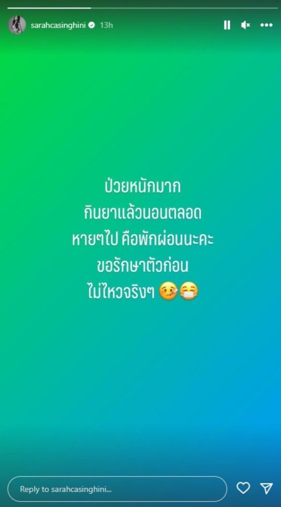 และล่าสุด สาวซาร่า โพสต์ข้อความผ่านสตอรี่ไว้ว่า “ป่วยหนักมาก กินยาแล้วนอนตลอด หาย ๆ ไปคือพักผ่อนนะคะ ขอรักษาตัวก่อน ไม่ไหวจริง ๆ “ ยังไงทางสยามรัฐขอส่งกำลังใจให้ พี่ซาร่า แข็งแรงไว ๆ นะคะ