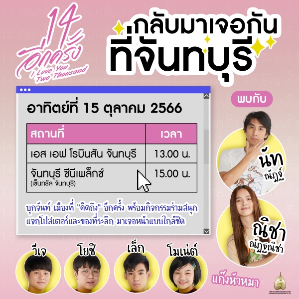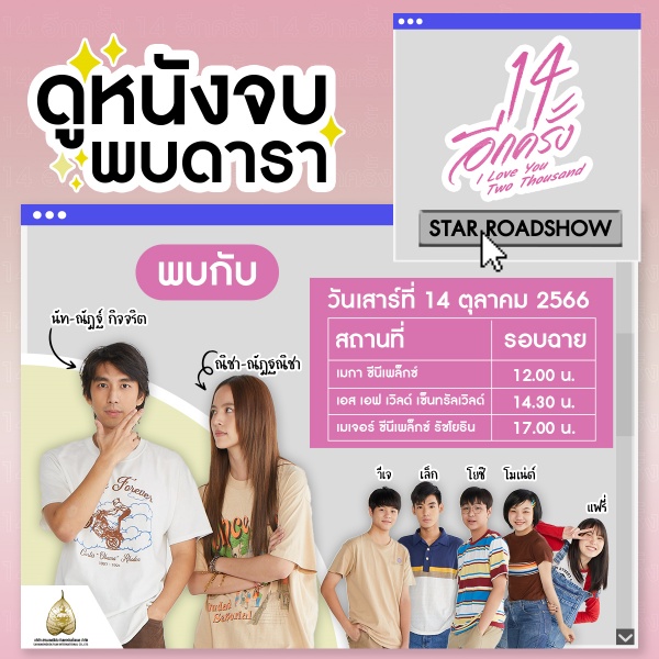 14-15 ตุลาคมนี้ “นัท” “ณิชา” นำทีมแก๊งวัยใสจาก “14อีกครั้ง I Love You Two Thousand” บุกเซอร์ไพรซ์แฟนหนังถึงโรงภาพยนตร์กทม.และจันทบุรี