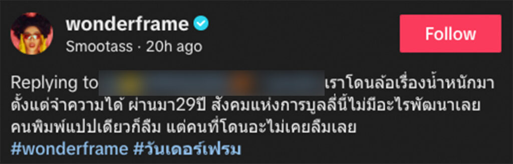 ล่าสุด! เจ้าตัวได้ใช้พื้นที่บนช่องติ๊กต๊อก @wonderframe อัดคลิประบายความในใจทั้งน้ำตา เกี่ยวกับคำวิจารณ์ดังกล่าว พร้อมกับระบุแคปชั่น “เราโดนล้อเรื่องน้ำหนักมาตั้งแต่จำความได้ ผ่านมา29ปี สังคมแห่งการบูลลี่นี้ไม่มีอะไรพัฒนาเลย คนพิมพ์แปปเดียวก็ลืม แต่คนที่โดนอะไม่เคยลืมเลย”