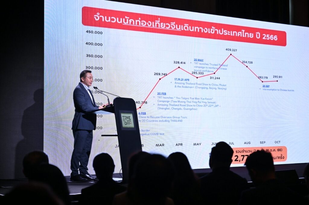 ประกอบกับในช่วงวันที่ 7-10 ตุลาคมที่ผ่านมา นายกรัฐมนตรีของไทยได้เข้าพบนายสี จิ้นผิง ประธานาธิบดีแห่งสาธารณรัฐประชาชนจีน ในโอกาสเยือนสาธารณรัฐประชาชนจีนอย่างเป็นทางการ เพื่อโปรโมทและสร้างความเชื่อมั่นต่อการเดินทางท่องเที่ยวไทย ทำให้มั่นใจว่าในช่วงไตรมาสสุดท้ายของปี 2566 จะมีนักท่องเที่ยวชาวจีนเข้ามาเที่ยวไทยเพิ่มขึ้นเป็น 700,000 คนต่อเดือน หรือ 30% หรือเพิ่มเป็น 4,100,000 คน ถึง 4,400,000 คน จากเดิมที่ไม่มีมาตรการฟรีวีซ่าอยู่ที่ 3,600,000 คนถึง 3,700,000 คน