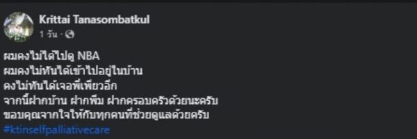 และอีกหนึ่งโพสต์ไว้ว่า “ผมคงไม่ได้ไปดู NBA ผมคงไม่ทันได้เข้าไปอยู่ในบ้าน คงไม่ทันได้เจอพี่เพียวอีก จากนี้ฝากบ้าน ฝากพีม ฝากครอบครัวด้วยนะครับ ขอบคุณจากใจให้กับทุกคนที่ช่วยดูแลด้วยครับ #ktinselfpalliativecare“ ท่ามกลางชาวเน็ตแห่ส่งกำลังใจให้คุณหมออย่างล้นหลาม