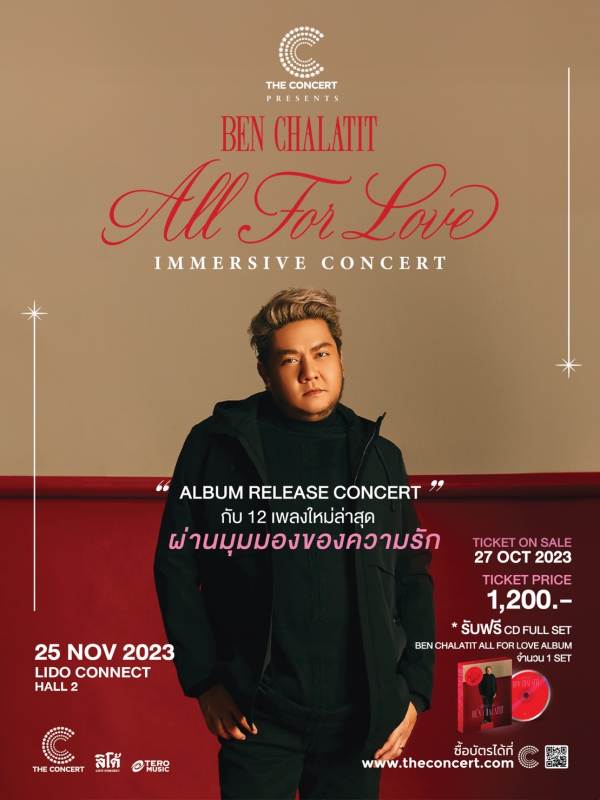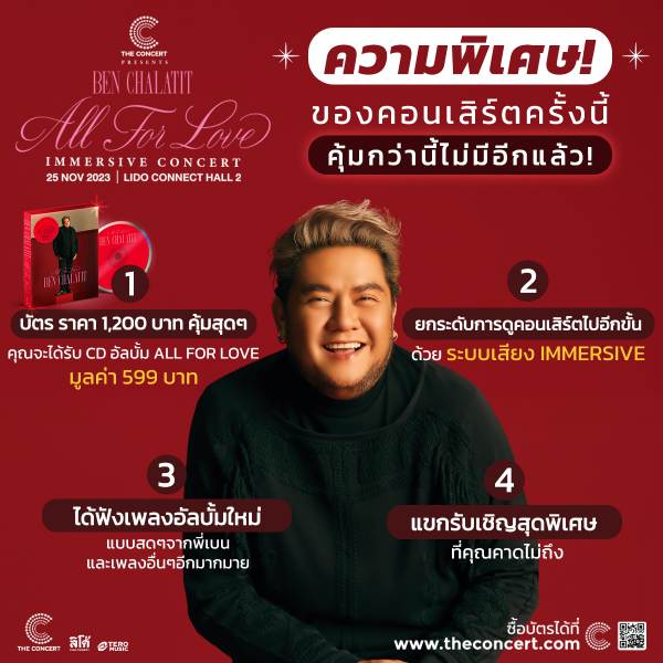 เปิดให้สาวกของศิลปินดีโว่เสียงทรงพลัง “เบน-ชลาทิศ ตันติวุฒิ” จองบัตรกันไปเรียบร้อยแล้ว กับ “The Concert Application presents Ben Chalatit ALL FOR LOVE Immersive Concert” Album Release Concertที่จะชวนแฟนเพลงมาร่วมเก็บความทรงจำดี ๆ มีความสุขไปกับเพลงในอัลบั้มชุดใหม่ All For Love งานนี้เบนจัดหนักความคุ้มค่าสุดพิเศษ!! มาเสิร์ฟให้ทุกคนที่มาชมคอนเสิร์ตครั้งนี้แบบไม่มีกั๊ก!! เพราะนอกจากจะได้ฟังเพลงใหม่ทั้ง 12 เพลงจากอัลบั้ม All For Love รวมถึงเพลงฮิตของเบนที่หลายคนคิดถึงในแบบที่เพราะกินใจแล้ว ยังเปิดประสบการณ์ยกระดับการชมคอนเสิร์ตกับระบบเสียง Immersive ที่ถูกออกแบบมาเพื่อให้ผู้ฟังได้รับเสียงคมชัด ในแบบ High Performance Top3 ในโลกที่ใช้ในการจัดคอนเสิร์ต เพิ่มความพิเศษและอรรถรสในการชมคอนเสิร์ตในรูปแบบของ 3D กับเสียงดนตรีที่มารอบทิศทางทุกมิติ