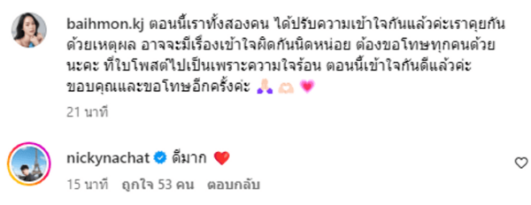 แต่ทันได้นั้น สาวใบหม่อน ประกาศ ข่าวดี พร้อมเล่าเรื่องราวทั้งหมดไว้ดังนี้ “ตอนนี้เราทั้งสองคน ได้ปรับความเข้าใจกันแล้วค่ะเราคุยกันด้วยเหตุผล อาจจะมีเรื่องเข้าใจผิดกันนิดหน่อย ต้องขอโทษทุกคนด้วยนะคะ ที่ใบโพสต์ไปเป็นเพราะความใจร้อน ตอนนี้เข้าใจกันดีแล้วค่ะ ขอบคุณและขอโทษอีกครั้งค่ะ” ซึ่งเหตุการณ์นี้ทำให้เกิดกระแสคอมเมนต์ และเสียงวิพากษ์วิจารณ์มากมาย ว่าเป็นคอนเทนต์รึเปล่า