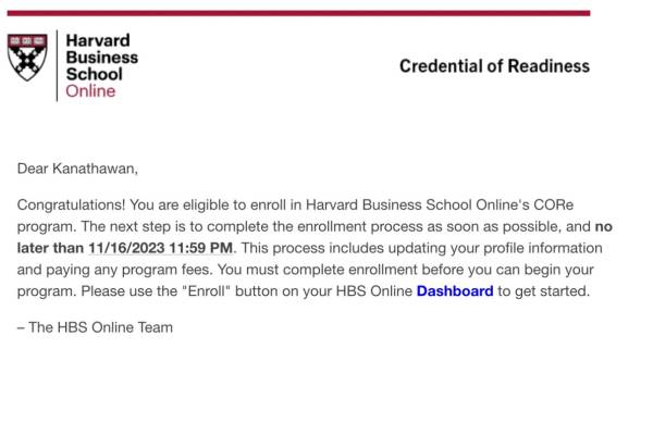 ซึ่งโปรแกรมแรกที่จูนเรียน ต้องใช้เวลาประมาณครึ่งปีถึงจะจบและได้ผลการเรียน เพราะมีการสอบ Final ด้วยค่ะ อาจารย์ที่สอนจูนก็ระดับโลกมาก ๆ ค่าเทอมเฉพาะค่าวิชาเรียนอย่างเดียวในโปรแกรมแรกนี้ก็ร่วมแสน จูนก็ดำเนินการลงทะเบียนและชำระค่าเทอมเรียบร้อยครบทุกกระบวนการแล้ว รอเปิดเทอมค่ะ และเมื่อเราสอบ Final เสร็จและเรียนจบ ทางมหาวิทยาลัย Harvard จะออกหนังสือรับรองผลการเรียนและการจบให้เราค่ะ เรียกว่าใบ credential of readiness (โปรแกรมที่จูนเรียนนี้จะไม่ใช่ใบเซอร์) หลังจากนั้น จูนก็ดำเนินการเรียนต่อในสเต็ปต่อไปค่ะ ซึ่งโปรแกรมที่จูนเลือกเรียน คือ core program วิชาเรียนในโปรแกรมนี้ก็เหมือนเป็นการเรียน pre MBA แบบที่หลาย ๆ คนเตรียมพร้อมจะเข้าเรียน MBA Harvard Business School อย่างเต็มตัวนั่นเองค่ะ ซึ่งก็ต้องไปเรียนที่มหาวิทยาลัย Harvard ที่อเมริกา 2 ปีกันเลย โปรแกรมนี้ตรงสายกับคนที่กำลังจะเข้าเรียน MBA ค่ะ ซึ่งโปรแกรมที่จูนเรียนจะมีวิชาหลัก ๆ ทาง MBA ของระดับผู้นำ ผู้บริหารอยู่ 3 วิชาค่ะคือ economic for manager ,business analytics, financial accounting ซึ่งโชคดีที่จูนเรียนจบ ป.ตรี คณะเศรษฐศาสตร์การค้าระหว่างประเทศมา เรียกว่าตรงสายนี้ของมหาวิทยาลัยเลยค่ะ จูนเลยได้ตัดสินใจเลือกเรียน Harvard Business School Online เพราะขณะนี้ จูนก็กำลังศึกษาระดับปริญญาโท การทูตและความสัมพันธ์ระหว่างประเทศอยู่ที่เมืองไทยด้วย แผนการเรียนที่จูนเลือกก็จะลงตัวกับจูนมากที่สุดในตอนนี้ ก่อนจะเรียนไปถึงสเต็ปต่อไปค่ะ