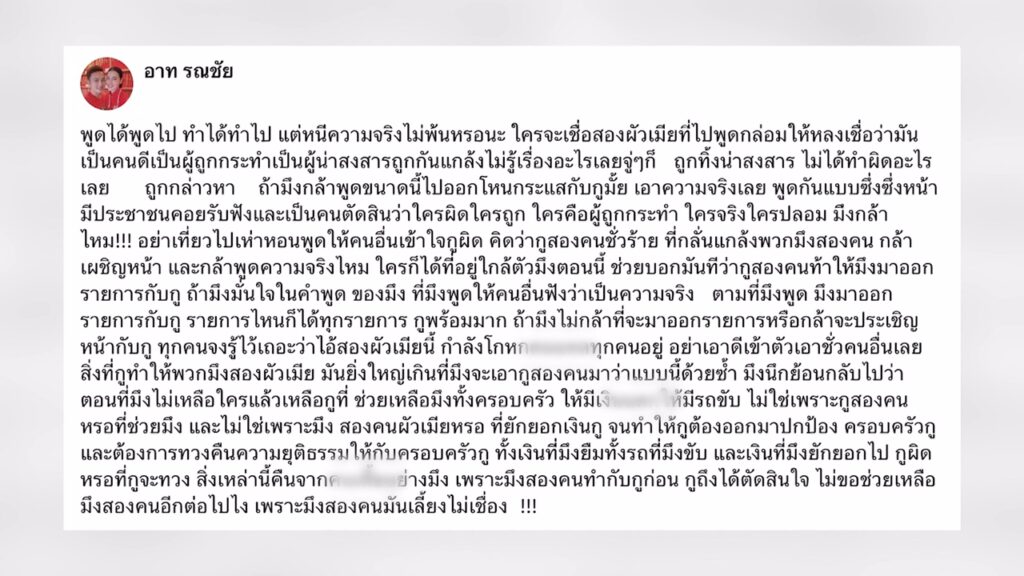 โดยที่ไม่รู้ว่าความจริงแล้ว เรื่องราวเป็นอย่างไร เราไปกลั่นแกล้งเขาจริงหรือเปล่า เราไปทำอะไร 2 ผัวเมียนี้คนรอบๆข้างผมไม่มีใครมาถามผม แต่เขาเลือกที่จะเชื่อ 2 ผัวเมียนี้ที่ไปพูด จนคนรอบข้างเกลียดเรา