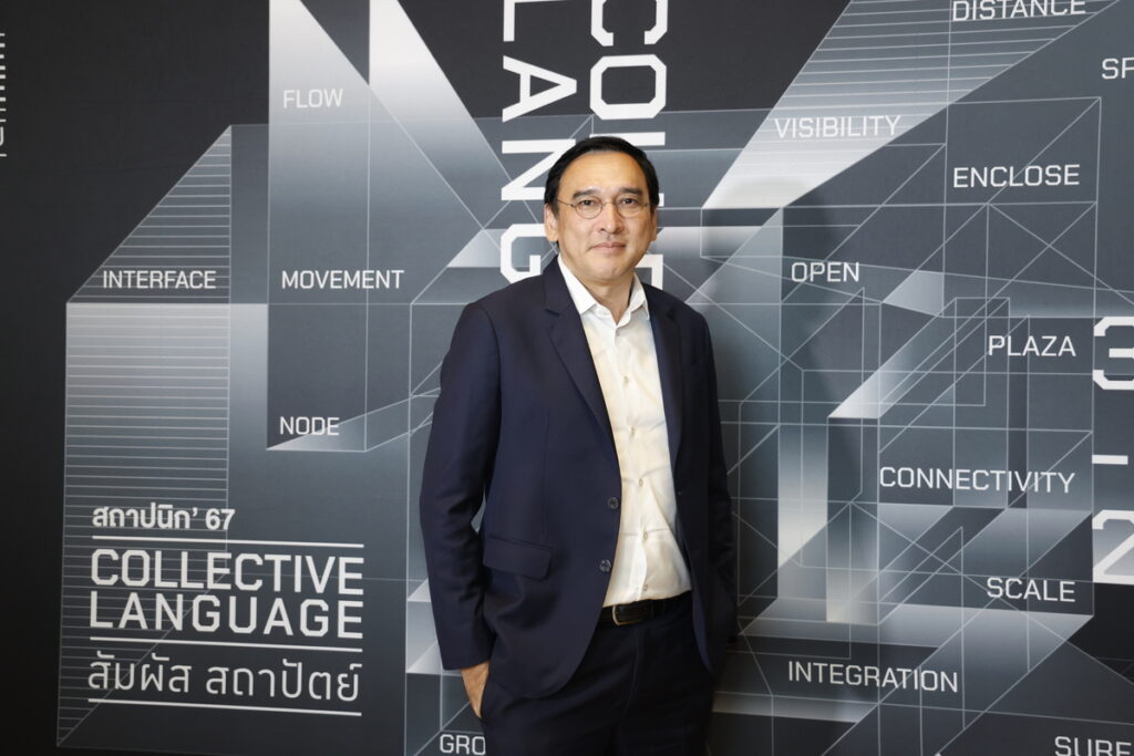 นางสาวกุลธิดา ทรงกิตติภักดี ประธานจัดงานสถาปนิก’67 กล่าวถึงที่มาของ ‘Collective Language : สัมผัส สถาปัตย์’ แนวคิดหลักในการจัดงานว่า มนุษย์ใช้ภาษาเป็นเครื่องมือในการสื่อสารเพื่อติดต่อกัน โดยปัจจุบันพบว่ามีภาษามากกว่า 7,000 ภาษาทั่วโลกที่ถูกใช้ในการสื่อสาร ขณะที่ศิลปวัฒนธรรมของแต่ละชาตินั้นถือเป็นเครื่องมือสื่อสารทรงพลังอีกเครื่องมือหนึ่งในการสร้างความเข้าใจเรื่องราวระหว่างผู้คนต่างชาติต่างภาษา งานสถาปนิก’67 ในปีนี้ เป็นการนำเสนอถึงอัตลักษณ์ของการสื่อสารด้วยภาษาที่ไร้ขอบเขตของสถาปนิกและนักออกแบบ เน้นย้ำถึงความสำคัญของงานสถาปัตยกรรมและการออกแบบที่สัมผัสได้โดยผู้คนจากทั่วทุกมุมโลก โดยสถาปนิกสามารถสร้างความรู้สึกทางรูปธรรมอันหลากหลายผ่านการใช้วัสดุและกระตุ้นความรู้สึกของผู้คนผ่านองค์ประกอบต่างๆ แบบนามธรรมในการรับรู้ถึงสถาปัตยกรรม ซึ่งการรับรู้ด้วยภาษาทางการออกแบบที่มีอยู่ร่วมกัน ก็เพื่อให้ผู้เข้าชมได้สัมผัสและเข้าถึงผลงานสถาปัตยกรรมดีเด่นจากทั่วโลกที่เชื่อมโยงถึงกันด้วยภาษาสถาปัตยกรรมนั่นเอง