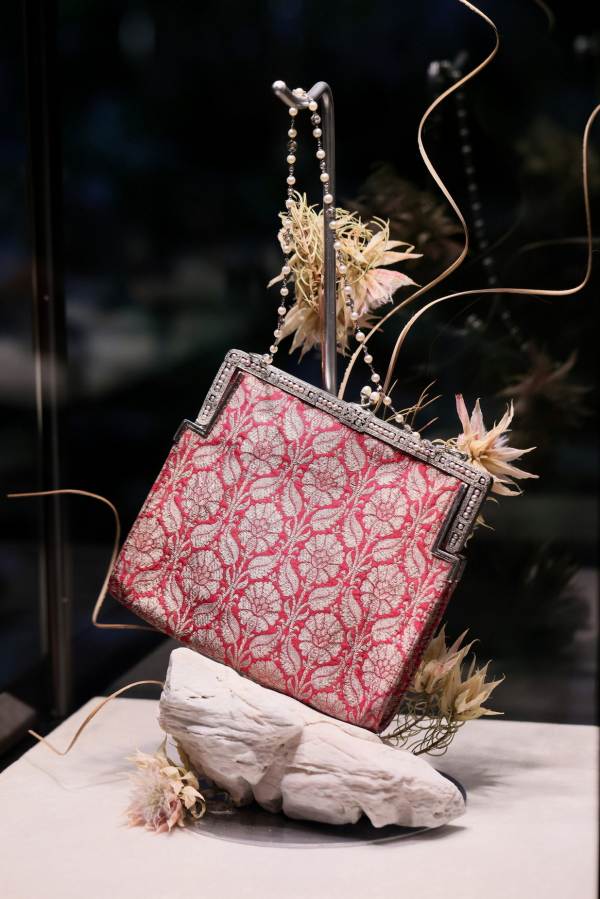 กระเป๋า authentic vintage material โดดเด่นด้วยลวดลายเป็นเอกลักษณ์จากผ้าโบราณหายาก อาทิ Petite Pink and Gold Silk กระเป๋าวินเทจใบหรู ทำจากผ้าไหมทอมือลายดอกไม้สีทองและสีชมพู กรอบทำจากแพลทินัมตั้งแต่ต้นทศวรรษ 1900 ประดับเพชรและไข่มุกญี่ปุ่น
