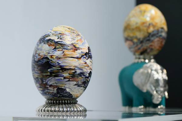 Ostrich Egg Silver ภาพมังกร สัญลักษณ์แห่งพลังและความรุ่งโรจน์ในปีที่กำลังจะมาถึง ด้วยลายเส้นของเมฆเรียงร้อยเป็นรูปมังกรเต็มไปด้วยพลังที่มีชีวิตชีวา สื่อถึงความรู้สึกของความเร็ว ตั้งอยู่บนฐานรูปคลื่นทำจากเงิน และ Elephant with Ostrich Egg ภาพความงดงามของธรรมชาติ สายน้ำ ป่า ภูเขาที่เรียงตัวสลับซับซ้อน หลอมรวมกันเป็นท้องฟ้าที่ส่องสว่าง จากแสงของดวงอาทิตย์ ดวงจันทร์และดวงดาว เพิ่มความโดดเด่นด้วยฐานรูปช้าง