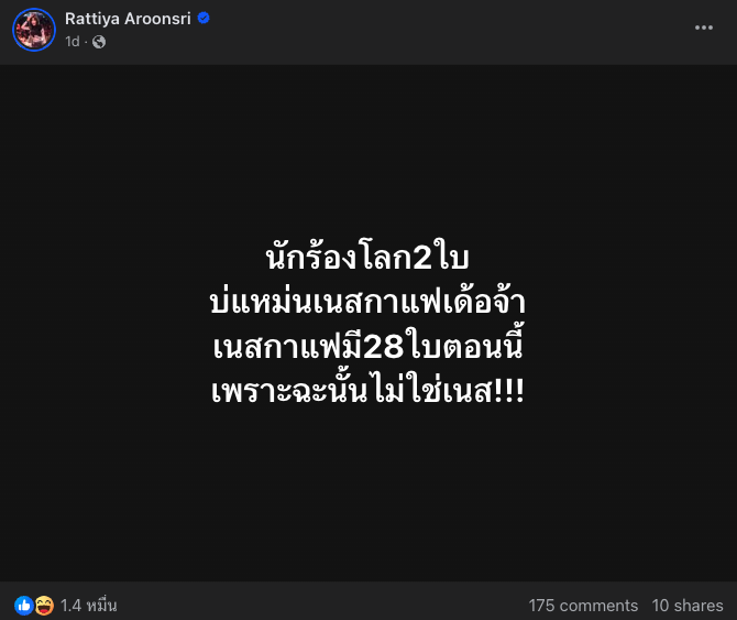 หลังจากที่โพสต์ไม่นานเท่าไหร่ เหล่านักร้องสาวหลายต่อหลายคนต่างออกมา บอกว่าไม่ใช่คนที่เอ่ยถึง ร่วมถึงนักร้องสาวสุดจี๊ดอย่าง เนสกาแฟ ศรีนคร หรือ เนส รัตติยา ก็ไม่พลาดที่จะออกมาชี้แจงโดยลั่นเอาฮา ไว้ว่า…