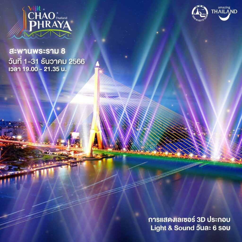 - สะพานพระราม 8 พบกับการแสดงเลเซอร์ 3D ประกอบ Light & Sound วันที่ 1-31 ธันวาคม 2566 วันละ 6 รอบ เวลา 19.00 – 21.35 น.