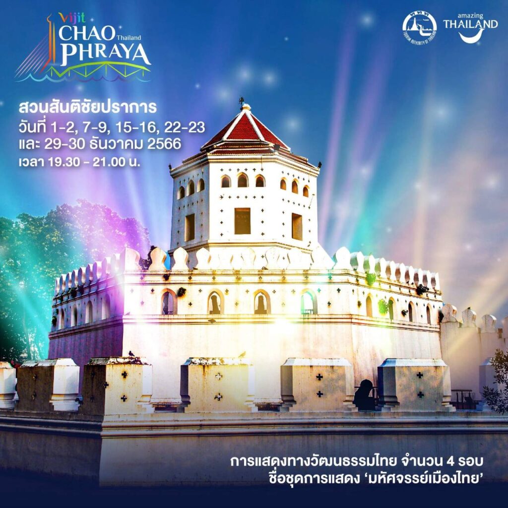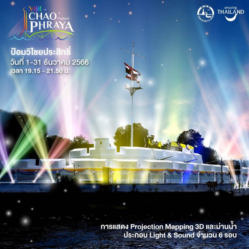 - ป้อมวิไชยประสิทธิ์ พบกับการแสดง Projection Mapping 3D และม่านน้ำ ประกอบ Light & Sound วันที่ 1-31 ธันวาคม 2566 วันละ 6 รอบ เวลา 19.15 – 21.50 น.