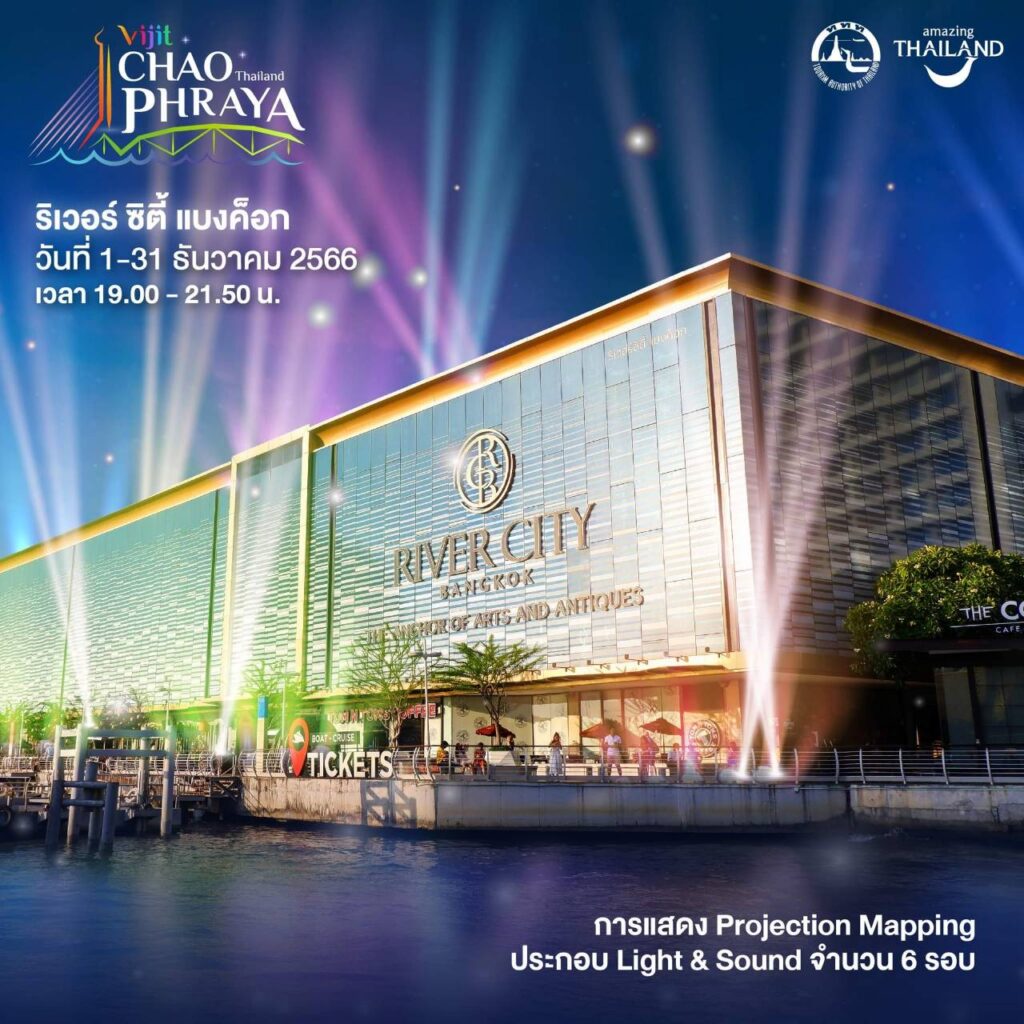 - ริเวอร์ ซิตี้ แบงค็อก พบกับการแสดง Projection Mapping ประกอบ Light & Sound วันที่ 1-31 ธันวาคม 2566 วันละ 6 รอบ เวลา 19.00 – 21.50 น.