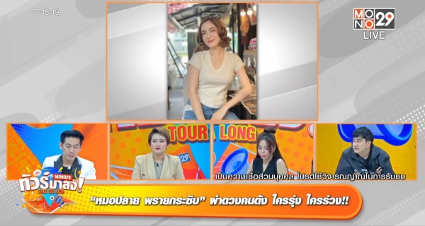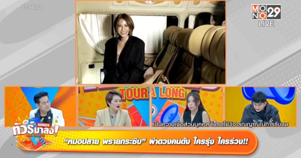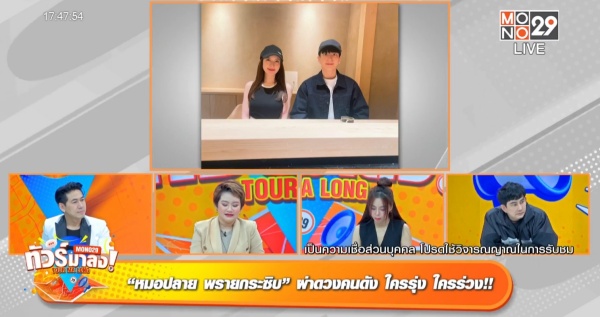 ต้อนรับเดือนธันวาผ่านเรื่องมูเรื่องดวงแม่น ๆ กับแม่หมอคนดังในรายการ “ทัวร์มาลง” ทุกวันจันทร์ถึงวันศุกร์ เวลา 17.05 น. ทางช่อง MONO29 ล่าสุดในวันศุกร์ที่ 1 พฤศจิกายนนี้ นำทีมโดยสามพิธีกรปากเผ็ดเบอร์แรง พชร์ อานนท์, เพชรจ้า-วิเชียร กุศลมโนมัย และ ซานิ-นิภาภรณ์ ฐิติธนการ ปรับวิจารณญาณพร้อมเปิดใจ ต้อนรับเดือนธันวาคมด้วยความเฮงความปังกับ หมอปลาย-ณวราชา พินิจโรคากร หรือ หมอปลาย พรายกระซิบ