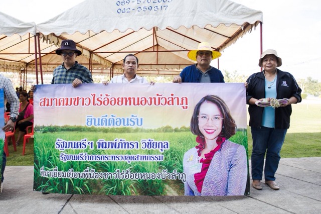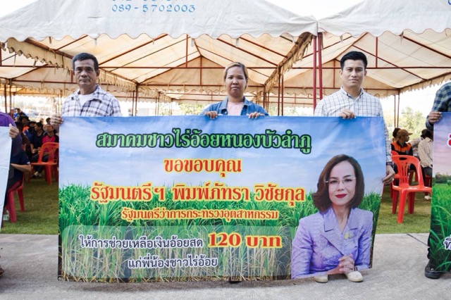 เมื่อ นางสาว พิมพ์ภัทรา วิชัยกุล รมว.กระทรวงอุตสาหกรรม และคณะ ได้เดินทางมาถึง นาย สมพร สังข์ศิริ ตัวแทนสมาชิกสมาคมชาวไร่อ้อยหนองบัวลำภู ได้ขอบคุณเป็นภาษาอีสาน ดังนี้ “ผมขอเป็นตัวแทนเกษตรกรชาวไร่อ้อยหนองบัวลำภู และชาวไร่อ้อยไทย ที่ได้รับของขวัญปีใหม่ได้รับเงินสนับสนุนตัดอ้อยสดตันละ 120 บาท รวมๆแล้วได้เงินเป็นหมื่นรที่สร้างรายได้เป็นเงินหลักหมื่น ต่อครอบครับ และหวังว่าจะมีของขวัญแบบนี้ให้ทุกๆปี แล้วชาวเกษตรกรชาวไร่อ้อยก็มีของขวัญปีใหม่คือสัญญาที่จะทำการเก็บเกี่ยวเฉพาะอ้อยสด เท่านั้นมอบให้ ครม. ด้วยเช่นกัน”