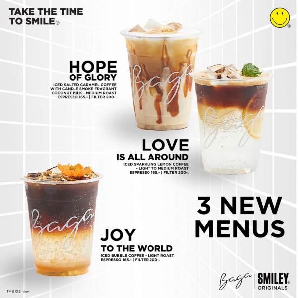 ทั้งนี้ BAGA x SMILEY® เป็นการคอลแลปส์ร่วมกันของแบรนด์ที่มีตัวตนชัดเจน นับเป็นกลยุทธ์ที่ “Café BAGA” ให้ความสำคัญมาโดยตลอด โดยโฟกัสความนิยมของแต่ละแบรนด์ร่วมกันสร้างสรรค์ผลิตภัณฑ์ใหม่ เพื่อสะท้อนเอกลักษณ์ของแบรนด์นั้น Café BAGA และ SMILEY® ต้องการสื่อสารภาพความสดใส ร่าเริง และทัศนคติในด้านบวก จากการดื่มกาแฟที่ดีที่สุด พร้อมกับรอยยิ้มในทุกเช้า แทรกด้วยความสนุกสนานของไลฟ์สไตล์ในรูปแบบต่าง ๆ เพื่อให้ทุกคนได้รู้สึก “ฟีลกู้ด” ไปพร้อม ๆ กัน สอดคล้องกับแนวทางการเติบโตที่สำคัญของแบรนด์ “Café BAGA” คือ ความใส่ใจใน “คุณภาพ” มาตรฐานรสชาติ และ “บริการ”เพื่อเป็น “Brand Lover”ในใจคอกาแฟทุกคน