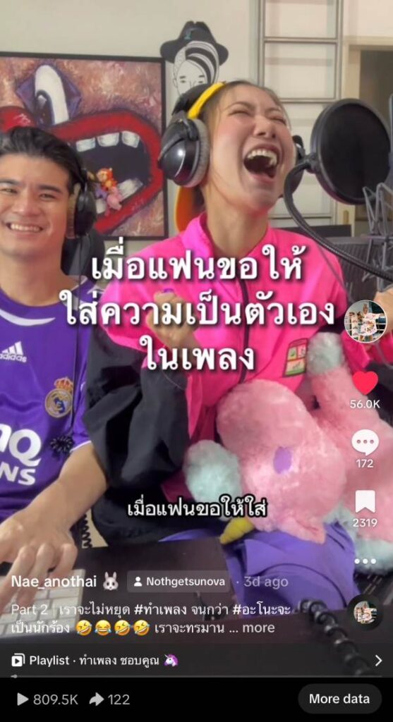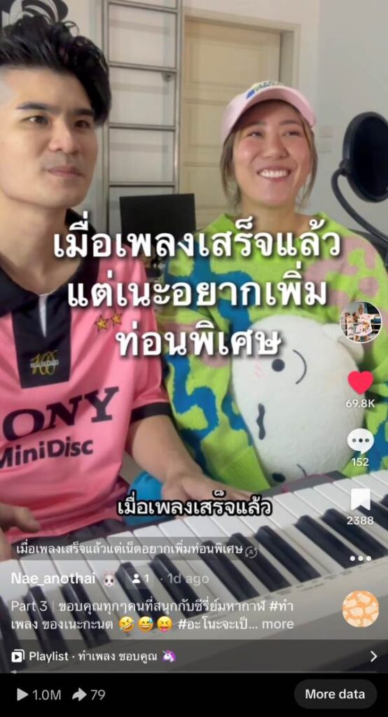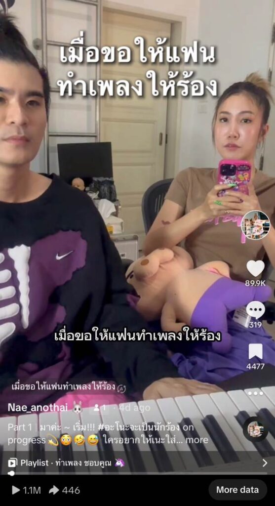 เป็นกระแสในโลกโซเชียลขึ้นมาทันที หลังคู่รักศิลปินอย่าง นต – ปณต getsunova และ ยูทูบเบอร์สาว เนะ อโณทัย จากช่อง ไหนเล่าซิ๊ ปล่อยคลิปแต่งเพลงกันสด ๆ ถึง 2 คลิป ซึ่งที่มาของการทำเพลงครั้งนี้ เนื่องด้วยเหตุผลที่ว่าสาว ‘เนะ อโณทัย’ ยื่นคำขาดกับสามี นต ว่าถ้าไม่ได้เป็นศิลปิน จะไม่ยอมท้อง!! ทำเอาแฟน ๆ ต่างรอลุ้นกันสุด ๆ กับปฏิบัติการทำเพลงพิชิตลูกของทั้งคู่ ซิงเกิลแรกอย่าง ‘ชอบคูณ’ จะออกมาให้ฟังแบบไหน โดยสาวเนะ ขอใช้ชื่อในนามศิลปินนักร้องว่า “Nae Ano”