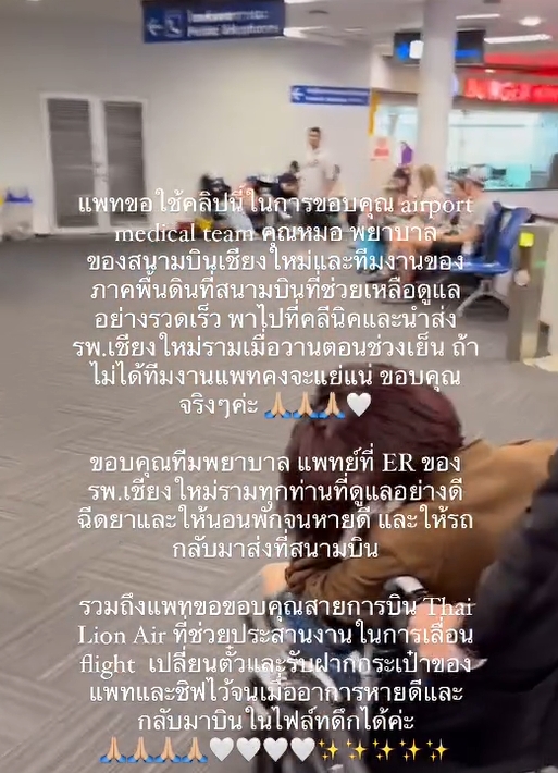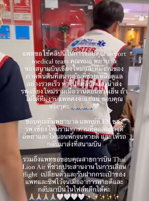 “แพทขอใช้คลิปนี้ในการขอบคุณ airport medical team คุณหมอ พยาบาล ของสนามบินเชียงใหม่และทีมงานของภาคพื้นดินที่สนามบินที่ช่วยเหลือดูแลอย่างรวดเร็ว พาไปที่คลีนิคและนำส่งรพ.เชียงใหม่รามเมื่อวานตอนช่วงเย็น ถ้าไม่ได้ทีมงานแพทคงจะแย่แน่ ขอบคุณจริง ๆ ค่ะ