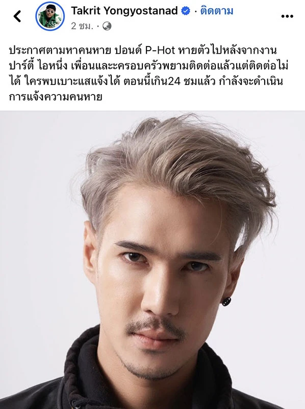 “ประกาศตามหาคนหาย ปอนด์ P-Hot หายตัวไปหลังจากงานปาร์ตี้ ไอ้หนึ่ง เพื่อนและครอบครัวพยายามติดต่อแล้วแต่ติดต่อไม่ได้ ใครพบเบาะแสแจ้งได้ ตอนนี้เกิน 24 ชม.แล้ว กำลังจะดำเนินการแจ้งความคนหาย”