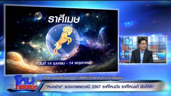 “ราศีที่ได้เกรด A อีกราศีในปี 66 คือผู้ที่เกิดในราศีเมษ แสดงว่าราศีพฤษภคือโคตร A เอาเมษ ก่อน เหตุผลแรกที่ A คือราหูออกไปแล้ว เมษเจอพระราหูมาตั้งแต่ปี 65 ดวงเมืองด้วย ราหูออกไปแล้ว แถมมีดาวพฤหัสเข้ามา ซึ่งเป็นดาวที่ดี ในปี 67 ดาวพฤหัสก็ยังอยู่กับราศีเมษ ถึงจะมีการเคลื่อนย้ายหลัง 30 เม.ย. ย้ายไปอยู่เรือนการเงิน หมายถึงความก้าวหน้าในเชิงการเงิน ราศีเมษจะก้าวหน้ามากขึ้น ก่อนหน้านี้ราหูออกก็จริงแต่ชีวิตยังไม่ค่อยดี เพราะดาวพฤหัสยังเดินไม่ปกติ เมษนี่ไม่ต้องรอเม.ย.นะ ม.ค.ปุ๊บ พฤหัสเริ่มเดินหน้าจะส่งผลให้ราศีเมษมีทิศทางที่ชัดเจนในชีวิต อยากทำอะไรได้ทำ อยากเริ่มอะไรได้เริ่ม ความรักก็อยู่ในเกณฑ์ที่โอเค แต่ดวงปี 67 เด่นเรื่องการเงินมากกว่า จะเติบโตในเรื่องการเงิน ชีวิตจะมีสวัสดิการที่ดีขึ้น มีโอกาสในเชิงรายได้มากขึ้น มีความก้าวหน้าเรื่องการเงินที่ดีขึ้น อุปสรรคปัญหาโรคภัยไข้เจ็บอะไรก็ตามที่เกิดขึ้นก็จะหมดไป เมษจึงเป็นราศีเกรด A ในปี 67 นี้”