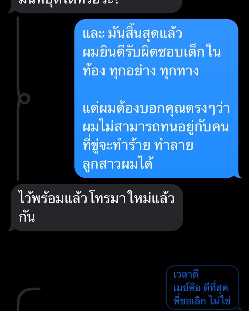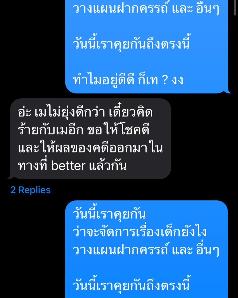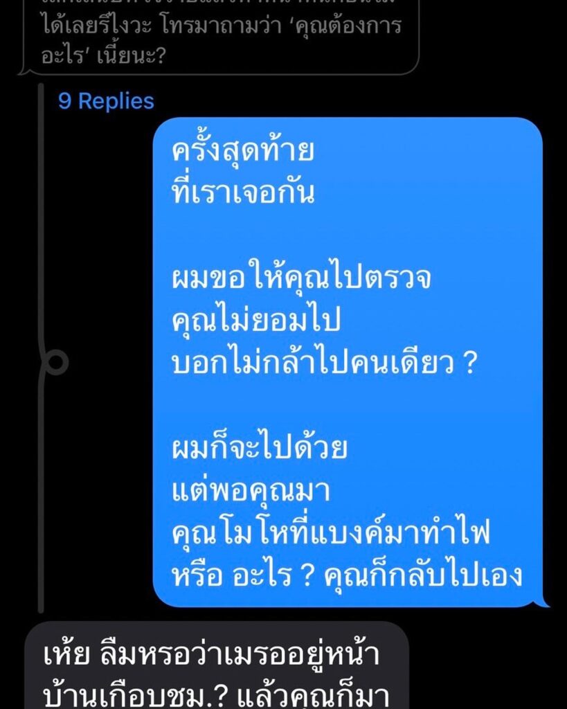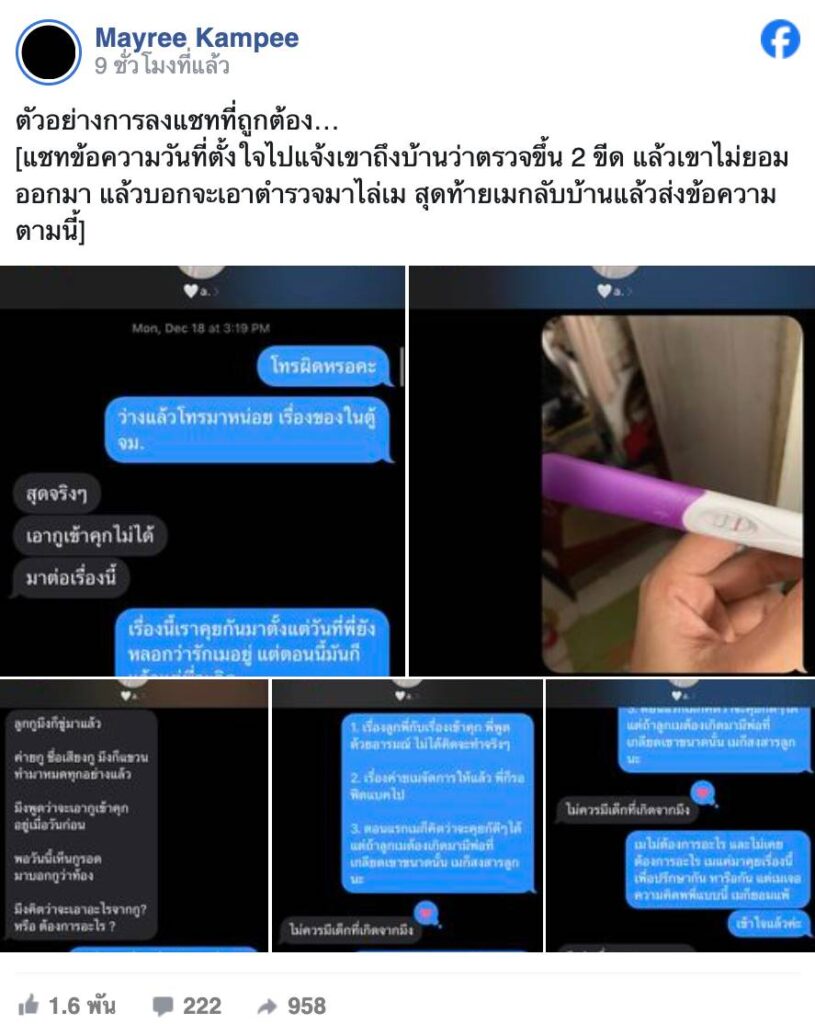 ส่วนทางด้าน สาวเมรี โพสต์ข้อความโต้กลับไว้ว่า ตัวอย่างการลงแชทที่ถูกต้อง…[แชทข้อความวันที่ตั้งใจไปแจ้งเขาถึงบ้านว่าตรวจขึ้น 2 ขีด แล้วเขาไม่ยอมออกมา แล้วบอกจะเอาตำรวจมาไล่เม สุดท้ายเมกลับบ้านแล้วส่งข้อความตามนี้]
