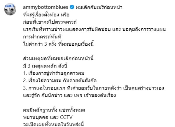 ล่าสุด หนุ่มแอมมี่ โพสต์ข้อความแจงเหตุผลที่ต้องเลิกราไว้ว่า “ผมเลิกกับเมรีก่อนหน้า