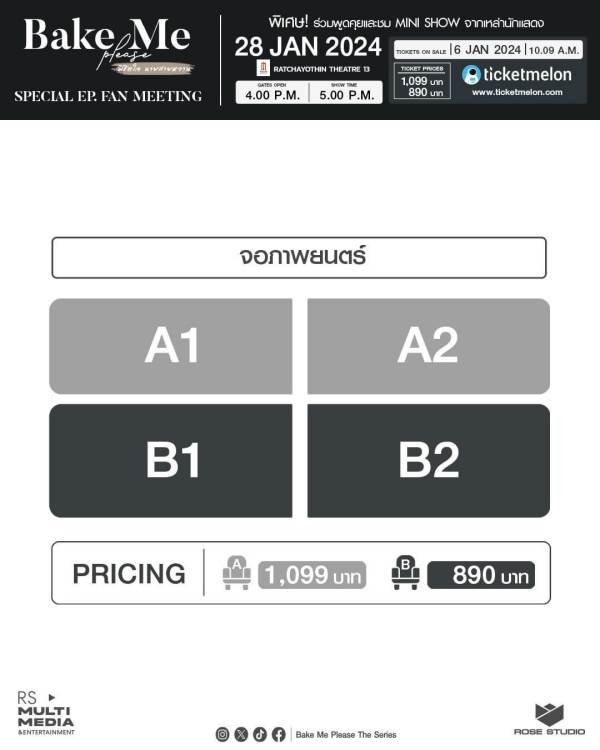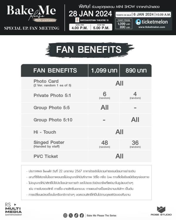 โดยจะเปิดขายบัตรผ่านทาง Ticketmelon ในวันที่ 6 มกราคม 2567 เวลา 10.09 น. ราคาบัตร Zone A1,A2 ราคา 1,099 บาท Fan Benefits (Photo Card, Private Photo 5:1 6 Random, Hi Touch, Singed Poster 48 Random And PVC Ticket) และ Zone B1,B2 ราคา 890 บาท Fan Benefits (Photo Card, Private Photo 5:1 4 Random, GroupPhoto5:10 , Hi Touch, Singed Poster 36 Random And PVC Ticket) ประกาศผล Benefit วันที่ 22 มกราคม 2567 ผ่าน FACEBOOK, X และ Instargram : Bake Me Please The Series ราคาบัตรยังไม่รวมค่าธรรมเนียมการชำระเงิน สามารถดูข้อมูลเพิ่มเติมได้ที่ www.ticketmelon.com