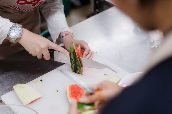 โดยเปิดโอกาสให้นิสิตได้ร่วมลงมือทดลองประกอบอาหารจริงจากแต่ละประเภทเมนู พร้อมทั้งร่วมเรียนรู้เทคนิคการจัดการวัตถุดิบอย่างมีประสิทธิภาพสูงสุด และในช่วงท้ายยังได้ให้น้อง ๆ นิสิตได้ร่วมกันระดมความคิดและนำเสนอไอเดียเมนูอาหารลดโลกร้อน (Co-Creation Menu) จนได้มากถึง 12 เมนูรักษ์โลกสุดสร้างสรรค์ สุดท้ายจึงได้คัดเลือก 4 เมนู จาก 4 กลุ่ม เพื่อเป็นตัวแทนของมหาวิทยาลัยในการถ่ายทอดแนวคิด “Too Good To Waste กินหมด ลดโลกร้อน” ผ่านการโชว์การประกอบอาหาร และแจกชิมให้กับเพื่อน ๆ นิสิตอีกด้วย