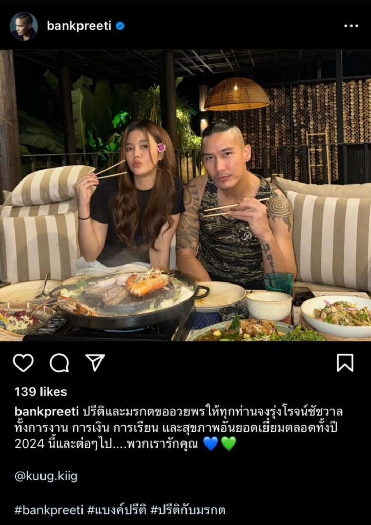ซึ่งล่าสุด หนุ่มแบงค์ โพสต์รูปคู่สุดหวานฉ่ำ พร้อมแคปชั่นอวยพรไว้ว่า “ปรีติและมรกตขออวยพรให้ทุกท่านจงรุ่งโรจน์ชัชวาลทั้งการงาน การเงิน การเรียนและสุขภาพอันยอดเยี่ยมตลอดทั้งปี 2024 นี้และต่อ ๆ ไป….พวกเรารักคุณ @kuug.kiig #bankpreeti #แบงค์ปรีติ #ปรีติกับมรกต” ต้องบอกเลยว่าภาพคู่ภาพแรกของทั้งคู่เลยค่าาา