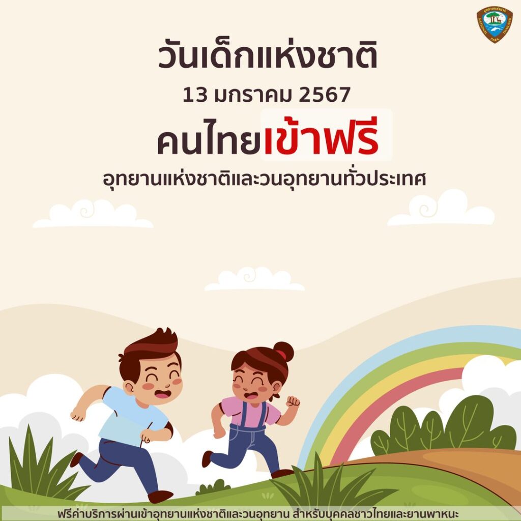อุทยานแห่งชาติ ในปี 2567 นี้ กรมอุทยานฯ ขอมอบของขวัญสุดพิเศษเนื่องในวันเด็กแห่งชาติ “ฟรีค่าบริการผ่านเข้าอุทยานแห่งชาติและวนอุทยาน สำหรับบุคคลชาวไทยและยานพาหนะ”