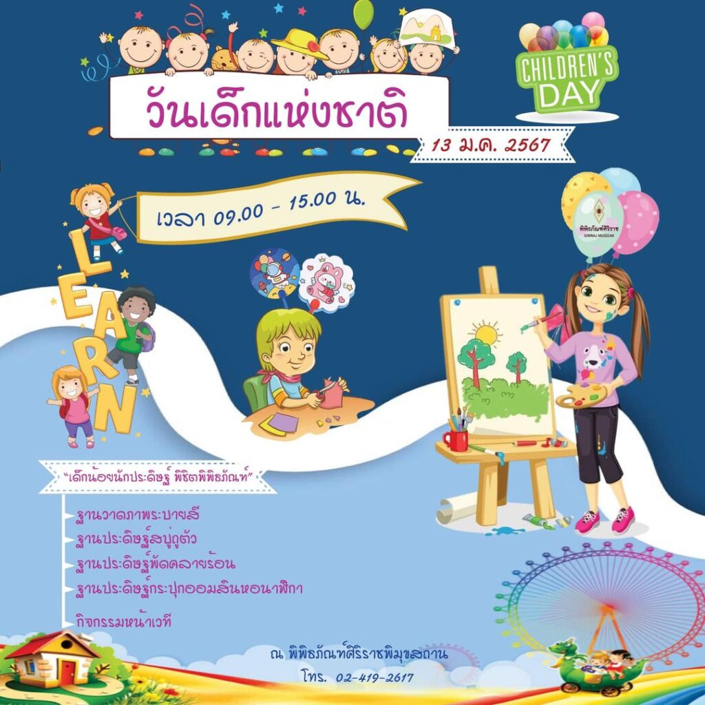 พิพิธภัณฑ์ศิริราชขอชวนน้อง ๆ มาร่วมกิจกรรมวันเด็ก “เด็กน้อยนักประดิษฐ์ พิชิตพิพิธภัณฑ์” ในวันเสาร์ที่ 13 มกราคม พ.ศ.2567 ตั้งแต่เวลา 09.00-15.00น. ณ พิพิธภัณฑ์ศิริราชพิมุขสถาน (บริเวณท่ารถไฟ) พบกับฐานกิจกรรม อาทิ
