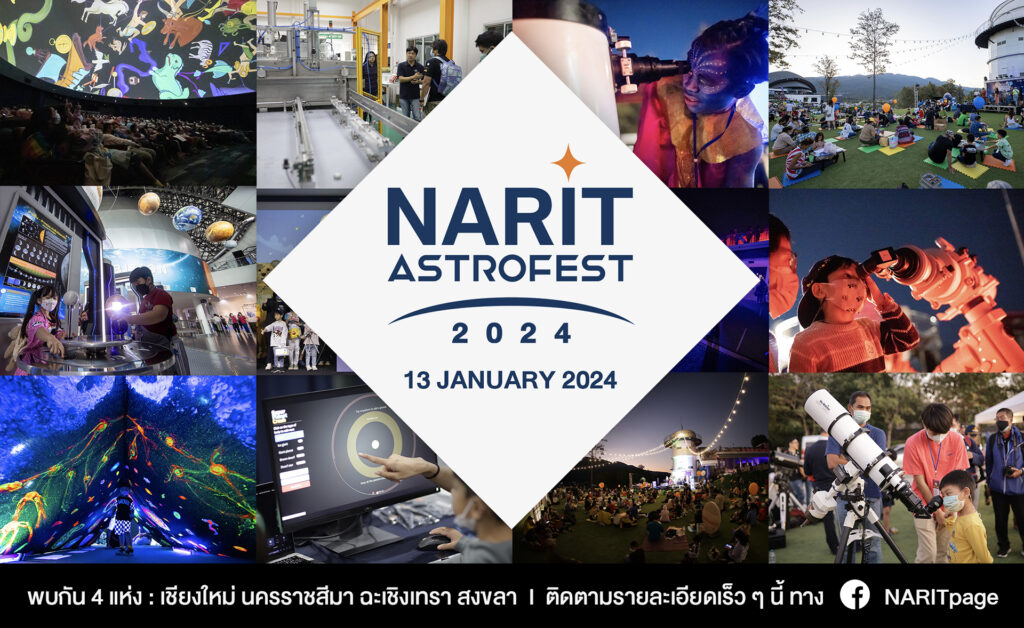 พบกับมหกรรมดาราศาสตร์สุดยิ่งใหญ่แห่งปี “NARIT AstroFest 2024” ในวันเด็กแห่งชาติ วันเสาร์ที่ 13 มกราคม 2567 พบกันได้ที่ 4 แหล่งเรียนรู้ดาราศาสตร์ของ NARIT ดังนี้