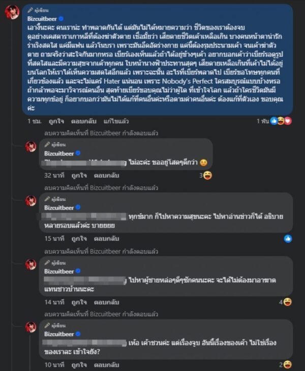 พร้อมกับร่ายข้อความฝากไว้ให้คิดไว้ว่า “เอางี้นะคะ คนเราน่ะ ทำพลาดกันได้ แต่มันไม่ได้หมายความว่า ชีวิตของเราต้องจบ ดูอย่างเคสดาราเกาหลีที่ต้องฆ่าตัวตาย เชื่อมั้ยว่า เสียดายชีวิตเค้าเหลือเกิน บางคนหน้าตาน่ารัก ร่าเริงสดใส แค่มีแฟน แล้วโนบรา เพราะมันอึดอัดร่างกาย แค่นี้ต้องรุมประนามเค้า จนเค้าฆ่าตัวตาย ถามจริงว่าสะใจกันมากหรอ เบียร์เองเห็นแล้วถ้าได้อยู่ข้าง ๆ เค้า อยากบอกเค้าว่าเบียร์รอดูรูปที่สดใสและมีความสุขจากเค้าทุกคน ใบหน้านางฟ้าประทานสุด ๆ เสียดายเหลือเกินที่เค้าไม่ได้อยู่บนโลกให้เราได้เห็นความสดใสอีกแล้ว เพราะฉะนั้น อะไรที่เบียร์พลาดไป เบียร์ขอโทษทุกคนที่เกี่ยวข้องแล้ว และจะไม่แคร์ Hater แน่นอน เพราะ Nobody’s Perfect ใครสมบูรณ์แบบบ้างหรอ ถ้ากล้าพอจะมาวิจารณ์คนอื่น