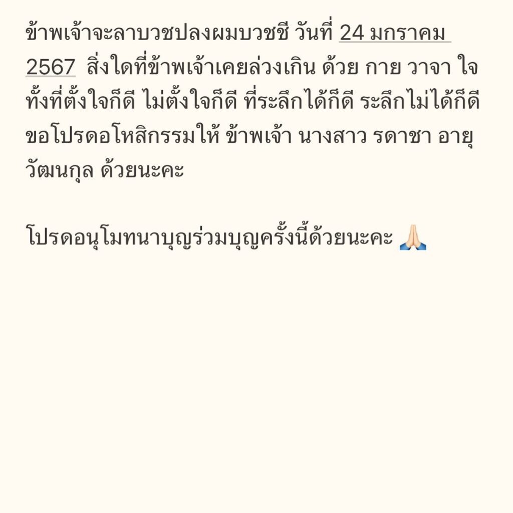 ล่าสุด แนน รดาชา ภรรยา ดีเจโก ได้แจ้งข่าวฤกษ์ของการปลงผมบวชชี โดยข้อความระบุไว้ว่า“ข้าพเจ้าจะลาบวชปลงผมบวชชี วันที่ 24 มกราคม 2567 สิ่งใดที่ข้าพเจ้าเคยล่วงเกินด้วย กาย วาจา ใจ ทั้งที่ตั้งใจก็ดี ไม่ตั้งใจก็ดี ที่ระลึกได้ก็ดี ระลึกไม่ได้ก็ดี ขอโปรดอโหสิกรรมให้ ข้าพเจ้า นางสาวรดาชา อายุวัฒนกุล ด้วยนะคะ โปรดอนุโมทนาบุญ ร่วมบุญ ครั้งนี้ด้วยนะคะ”