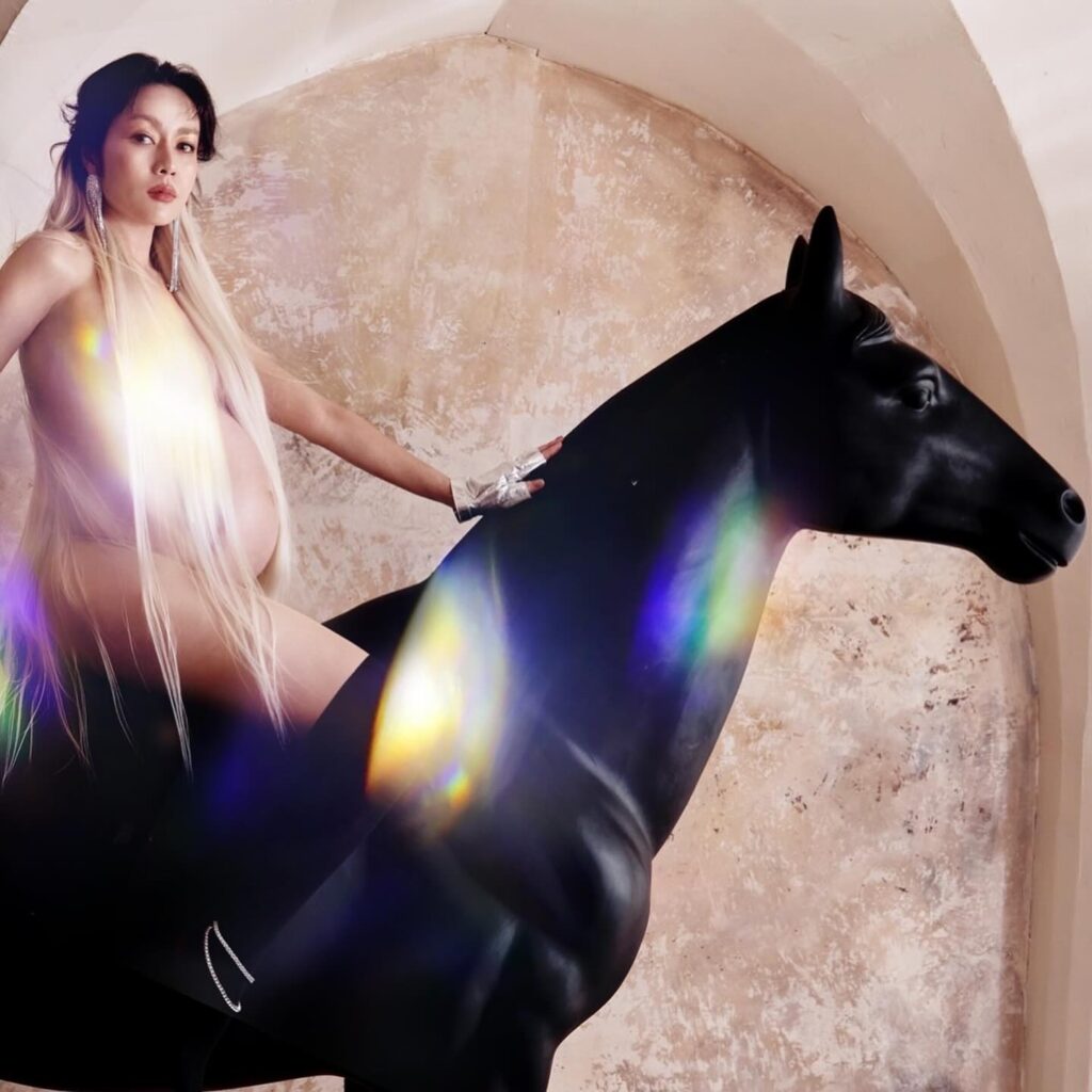 โดยเซ็ตรูปภาพนี้ พี่นิว อยู่ในช่วงที่กำลังอุ้มท้องลูกน้อย พร้อมกับรูปปั้นม้าสีดำตัวใหญ่ ที่ทำให้รู้สึกถึงความ เท่ห์และเซ็กซี่ อีกด้วย