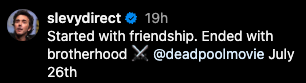 ทางด้าน ผู้กำกับ “Shawn Levy” ผู้ที่เพิ่งได้รับแฟรนไชส์ใน Deadpool 3 ได้โพสต์รูปภาพบน Instagram ของเขา โดยมี “ไรอัน เรย์โนลด์ส” และ “ฮิวจ์ แจ็คแมน” กำลังสวมกอดกัน “Shawn Levy” ได้ให้แคปชั่นเอาไว้ว่า “เริ่มต้นด้วยมิตรภาพ จบลงด้วยความเป็นพี่น้อง”